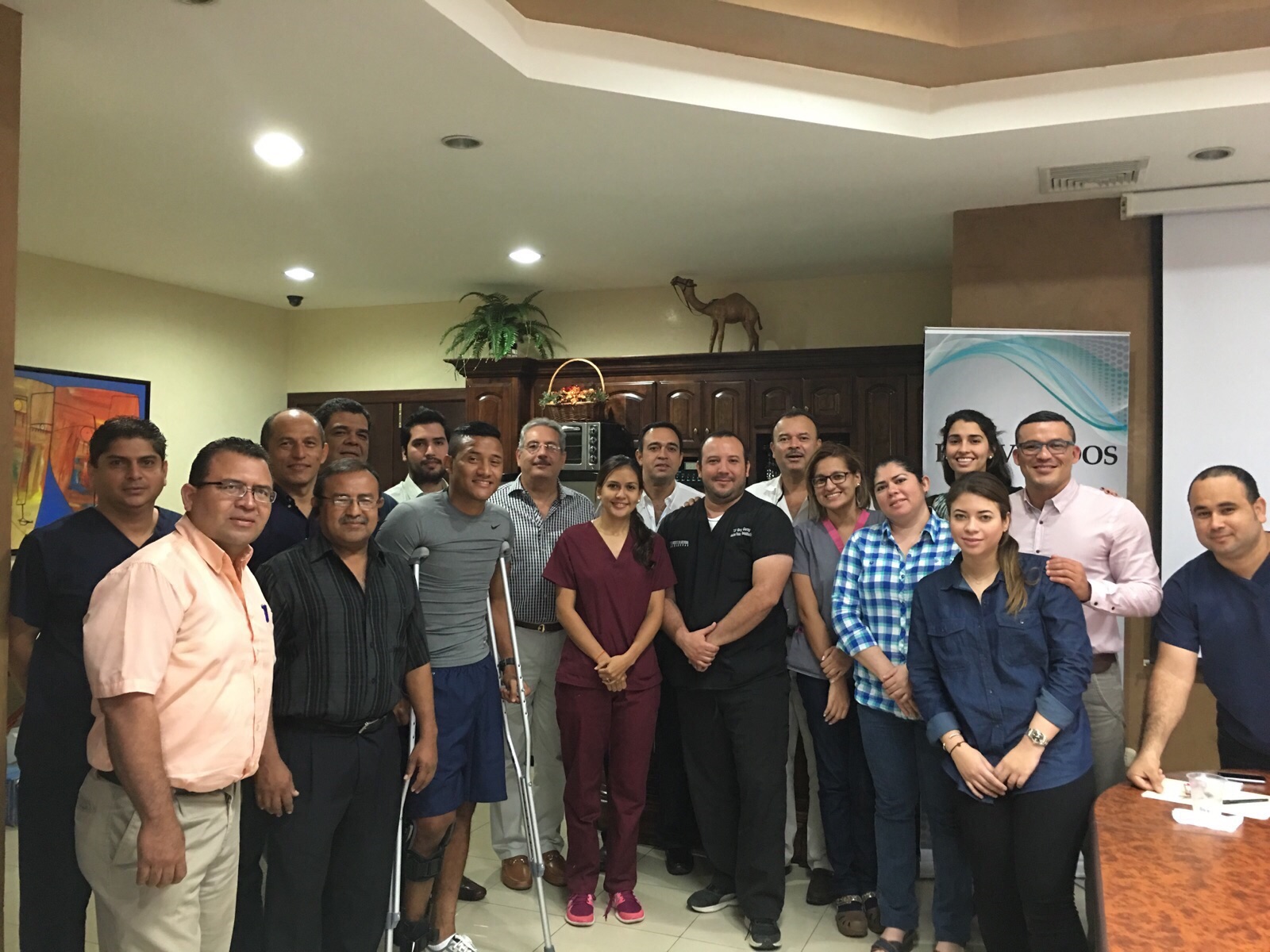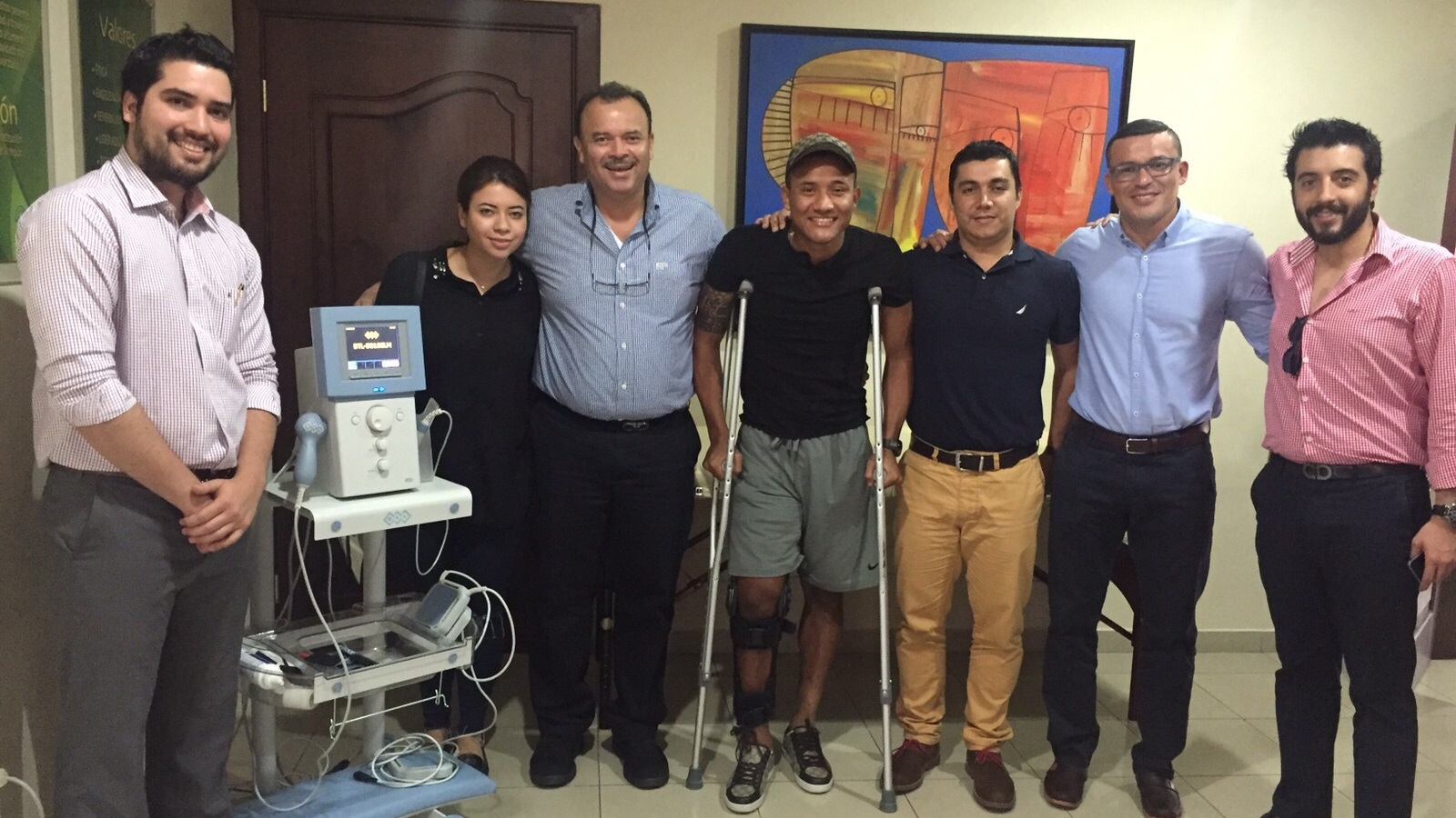 Personal medico y colegas del Dr. Benítez estuvieron en la capacitación dada por especialistas ticos. Foto HSIEn el caso de Daniel Tejeda, a quien también vimos en terapia, hicimos la misma pregunta pues es un caso menos severo que el de Luis Garrido. Ya sabíamos cuando abordamos a Tejeda hace una semana, que su periodo fuera de las canchas sería de seis a ocho semanas, preguntamos si sería posible recuperarlo antes. “El caso de Daniel es bueno porque ha evolucionado muy bien, recuerda que le realizamos una otoscopia de la rodilla y quitamos una calcificación con la que venía jugando casi toda su vida y que lo tenía con molestias por mucho tiempo y que lo tenía en el tendón patelar. Con el equipo que teníamos y con la rehabilitación que nosotros le realizamos pudo jugar casi todos los partidos de este torneo. Ya con esta nueva tecnología y su proceso de recuperación esperamos que el próximo campeonato lo haga al 100 % y si estamos confiando que la recuperación y de acuerdo a la evolución va a ser mucho mejor, pero en este tipo de lesiones tampoco podemos correr, hay que dar un tiempo por la cicatrización de los tejidos sobre todo el tendón patelar, son seis semanas y entonces hay que esperar y no estar corriendo. En el caso de los otros jugadores como Luis López, recuerda que en los últimos partidos de la Sub-23 en la clasificación a los Juegos olímpicos de Rio 2016, él no jugó porque está con un problema que se habló mucho que era una hernia y ahora que lo examinamos y que vino el Dr. Guillermo Toledo y Gilberto Reyes estamos viendo que es una pubalgia y con esta gente de BTL empezamos ya con el tratamiento de ondas de choque y esperemos con esto el jugador se pueda recuperar completamente pues es una patología muy incapacitante”, cerró diciendo Benítez.