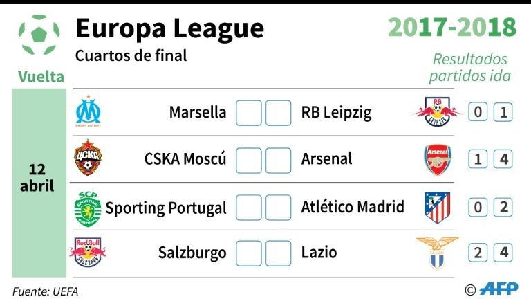 - Programa de los cuartos de final de la Europa League (resultado de la ida entre paréntesis) que se disputan el jueves a las 19h05 GMT: