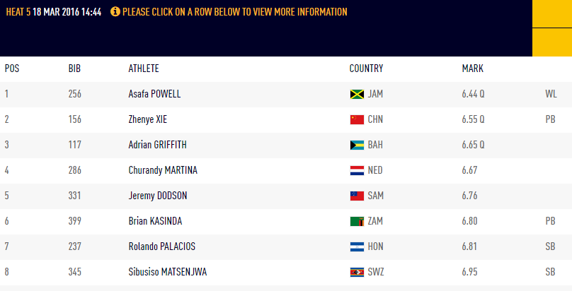 Asafa powell salió con ventaja pero quedó segundo al final. Foto IAAFEs el tercer mundial en esta modalidad que asiste el corredor catracho y su competencia fue ayer en la tarde. "Me alegra competir en un evento importante y la meta es hacer lo mejor por mi país. Es una competencia fuerte, pero siempre salgo con la misión de poner todo mi empeño", expresó el catracho antes de partir en la página oficial del Comité Olímpico Hondureño.