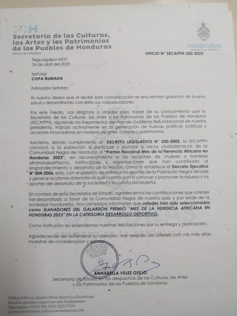 La Ceiba, Honduras. (HSI) - La Copa Numada que se realiza en el atlántico hondureño, ha sido declarada ganadora del Premio Nacional Mes de la Herencia Africana.