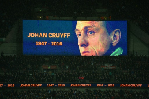 Una gran pantalla muestra la imagen del holandés internacional Johan Cruyff, fallecido el 24 de marzo, en un minuto de aplausos en su memoria durante un amistoso entre Inglaterra y Holanda, en el estadio de Wembley en Londres, el 29 de marzo de 2016- Técnica antes que físico -