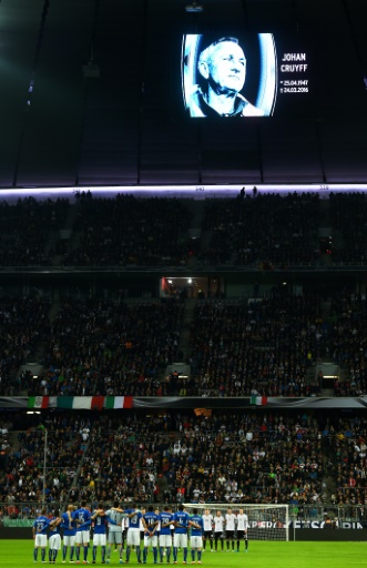 Una pantalla muestra la imagen del holandés internacional Johan Cruyff, fallecido el 24 de marzo, en un minuto de silencio en su memoria durante un partido entre Alemania e Italia, en Múnich, el 29 de marzo de 2016Además, el equipo catalán es favorito para ganar en mayo la Liga de Campeones, lo que supondría su quinto triunfo continental en 11 años y el segundo consecutivo tras el de 2015.