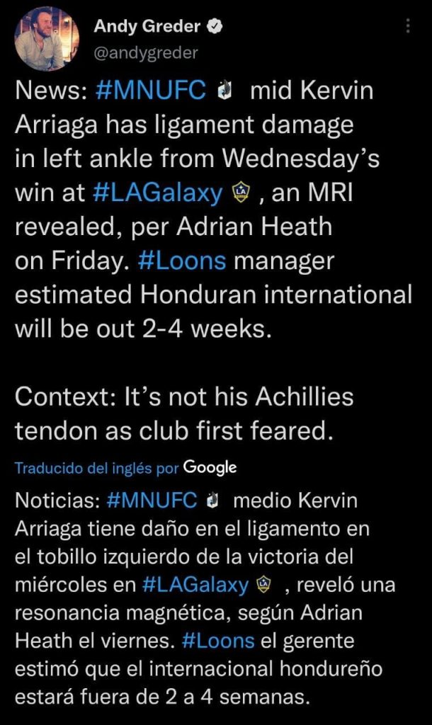 "Kervin Arriaga tiene daño en el ligamento en el tobillo izquierdo en la derrota del miércoles contra el Galaxy, reveló una resonancia magnética. El gerente estimó que el hondureño estará de baja entre dos a cuatro semanas", publicó Greder.