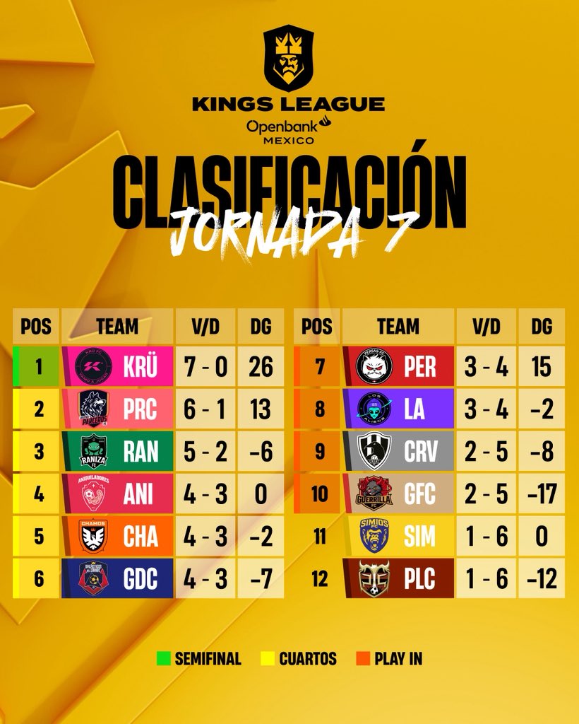 La jornada 7 deja un panorama cada vez más definido en la Kings League México, con KRÜ consolidado como líder absoluto y varios equipos en plena lucha por asegurar su lugar en los playoffs.