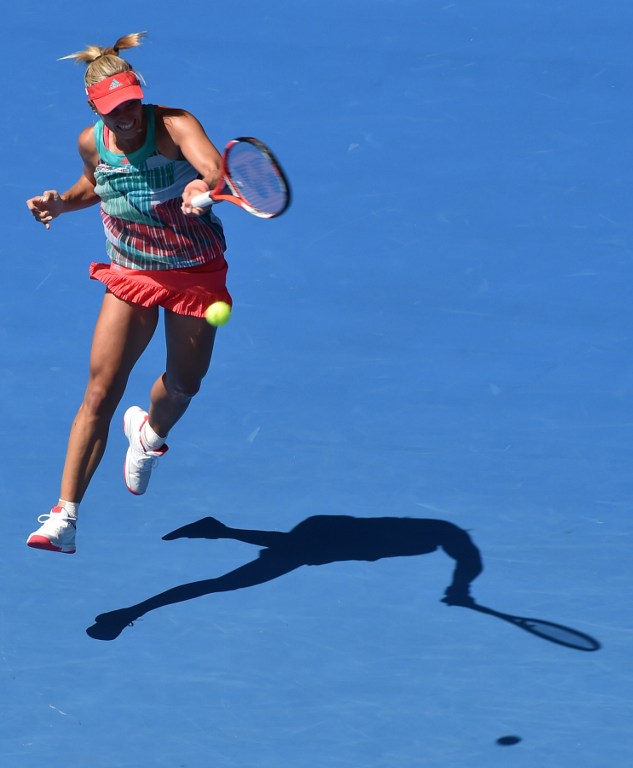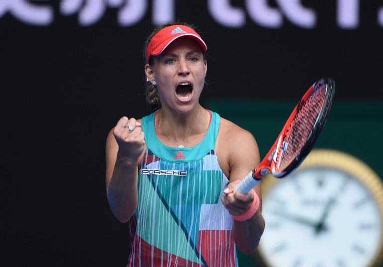 Germany's Angelique Kerber celebrates a point during her women's singles match against Belarus's Victoria Azarenka on day ten of the 2016 Australian Open tennis tournament in Melbourne on January 27, 2016. AFP PHOTO / WILLIAM WEST-- IMAGE RESTRICTED TO EDITORIAL USE - STRICTLY NO COMMERCIAL USE / AF