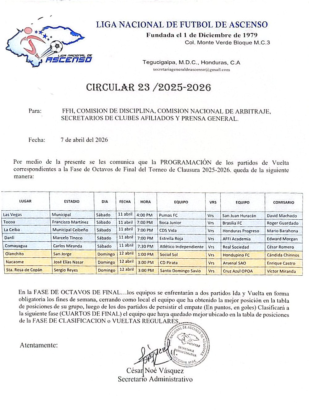 Circular octavos vuelta Clausura 2026.
