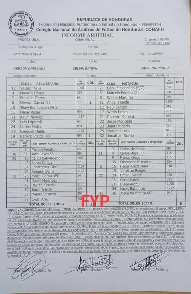 "Una vez finalizado el juego, estando los equipos y la terna arbitral en el terreno de juego, se realizó una invasión de aficionados del equipo Real España. En dicha invasión un aficionado agredió al árbitro asistente Jack Rodríguez pegándole una patada por la espalda, provocando dicho impacto que él cayera en el suelo en el estadio Olímpico".