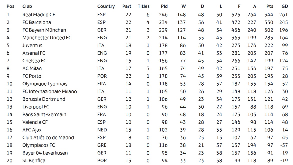 Un poco más atrás está el Bayern, que acaba de superar la barrera de los 300 puntos, el United, que se ha reencontrado con la competición esta campaña, o la Juventus, que cierra este particular Top-5 después de adelantar al Arsenal en la pasada edición.