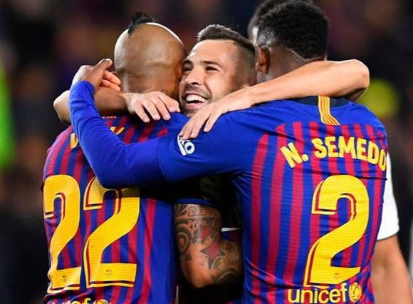 Vidal, Alba y Semedo celebran el quinto gol culé. Foto AP