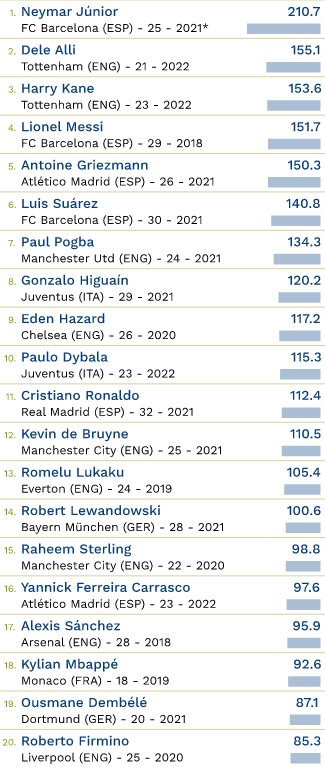 Messi sale por primera vez en mucho tiempo del Top 10. Su edad -va a cumplir 30 años- y el hecho de que aún no haya renovado le han hecho devaluarse un poco. En todo caso, si deja el Barcelona será por una cantidad inimaginable.