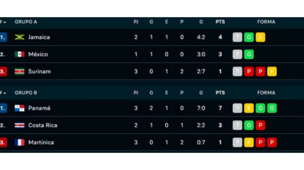 Costa Rica es segundo con tres puntos, aunque con dos partidos disputados, mientras que Martinica cierra la tabla con una unidad en tres encuentros.
