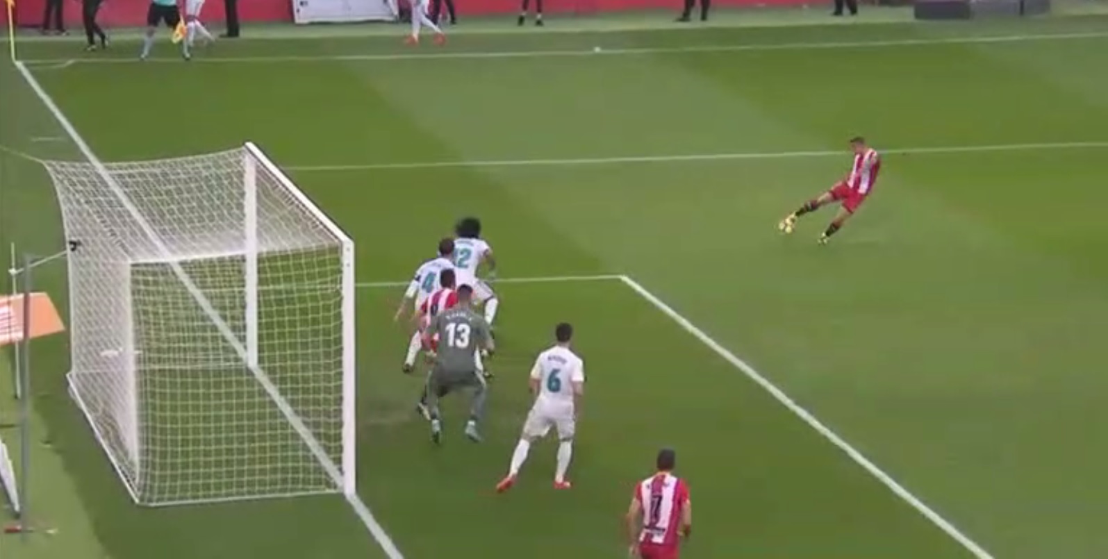La presión de un extramotivado Girona dio sus frutos y el lateral catalán Pablo Maffeo estrelló un balón en el poste en el minuto 12, justo antes que Isco adelantase a los blancos.