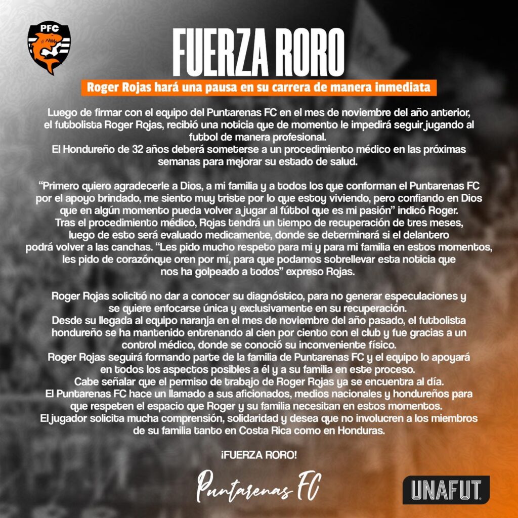 A través de un comunicado oficial, el Puntarenas FC del fútbol de Costa Rica publicó este anuncio sobre la salud del RORO, que estará fuera de las canchas por un tiempo.