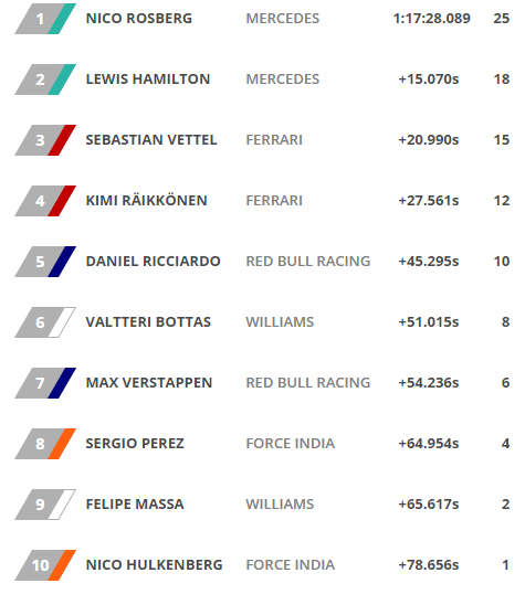 El piloto alemán redujo tras la victoria de hoy su distancia con Hamilton en el Mundial a dos puntos (250 a 248), gracias a una pésima salida del británico, en la que pasó del primero al sexto lugar, lo que le obligó a realizar una gran remontada con una estrategia de una sola parada con la que superó a los Ferrari para conseguir el segundo puesto.
