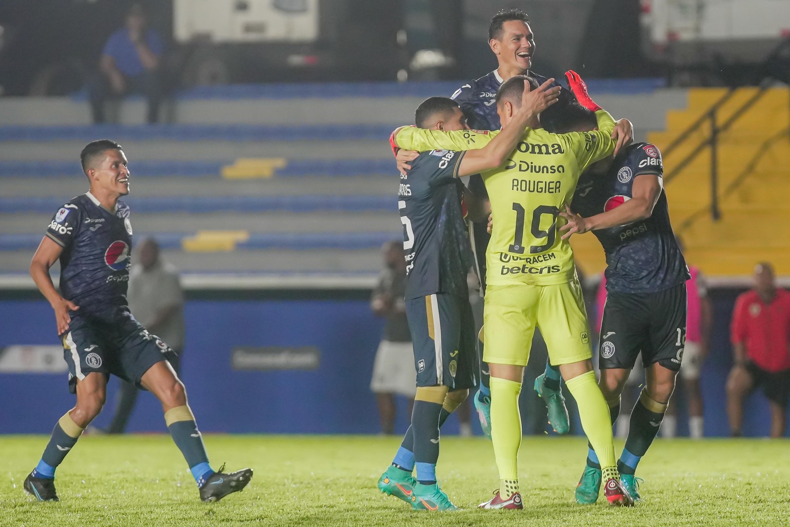 Los jugadores de Motagua abrazan a Rougier tras la clasificación. (PHOTO BY CRISTIAN ROSALES/CONCACAF/STRAFFON IMAGES)