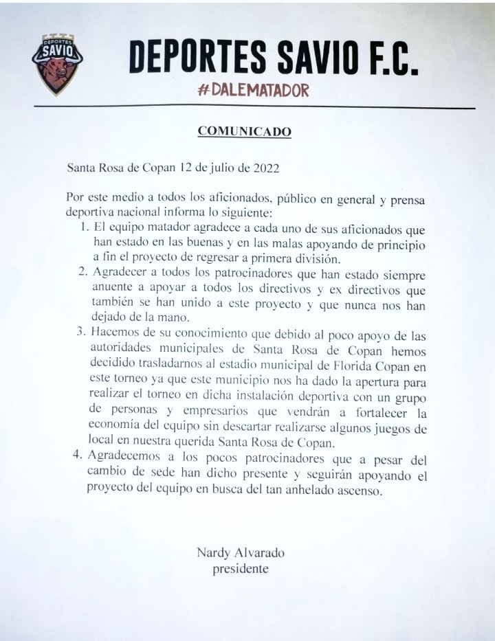 Deportes Savio deja Santa Rosa de Copán y se muda a otro municipio