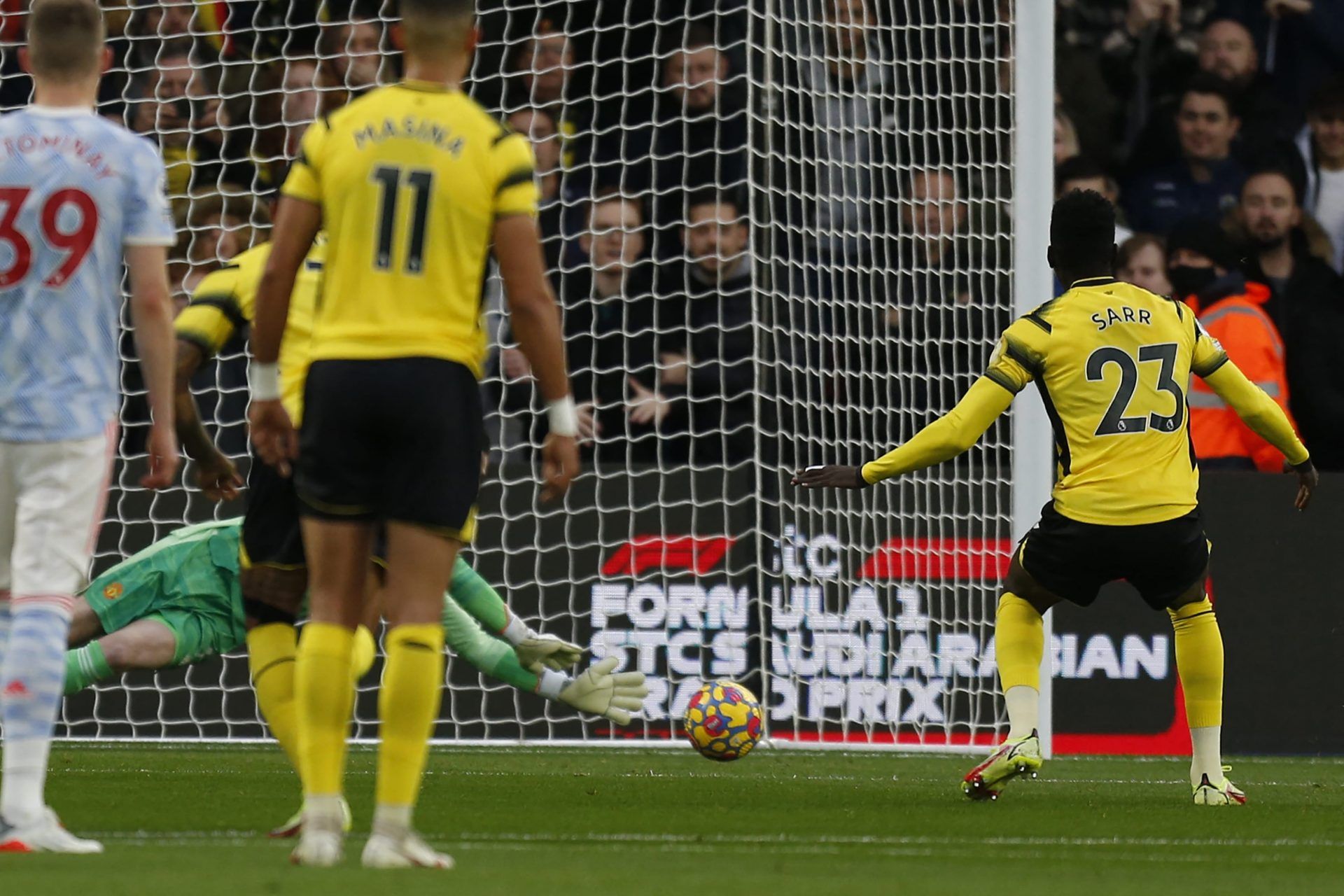 Watford arrancó mejor el encuentro y tuvo en dos ocasiones con un penal la ventaja del juego. De Gea tapó ambos lanzamientos de Sarr, en el primer intento un compañero suyo marcó en el rebote, pero había ingresado al área antes de la ejecución y se repitió.